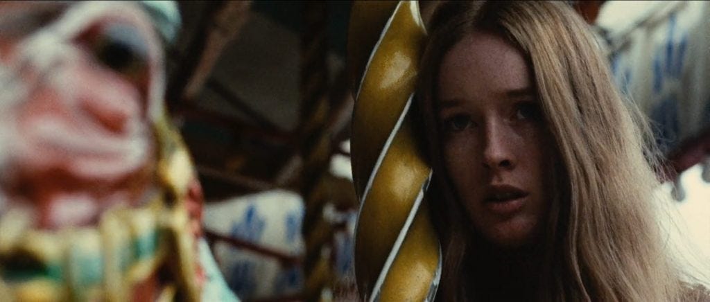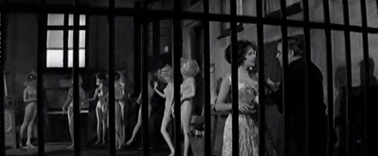 This preoccupation with perversion and sadomasochistic tendencies found in Room 13 is very much a reaction to and precursor of gialli which were also formulating at the same time in Italy. The menacing humor of the movie is highly similar to Mario Bava’s The Girl who Knew Too Much, released a year earlier in 1963. The more particular similarities occur in Bava’s next movie Blood and Black Lace (1964), released the same year as Room 13. The abundance of mannequins in the German movie is used more intentionally in the Italian film, which takes place in a haute couture fashion house. Like in many krimis, Denise’s room at the High and Low nightclub is illuminated by a flashing light right outside the window. We see this same effect in the creepy antique store that becomes a crime scene in Blood and Black Lace. Nicholas Schlegel takes note of the similarities between these two films in his book German Popular Cinema and The Rialto Krimi Phenomenon: “The Expressionist signatures that mark the Wallace Krimi, principally the chiaroscuro lighting, camerawork, and set design, had only been created for the abstract, chromatic universe of black and white cinematography. Bava, in contrast, detonated an effulgent big bang all his own resulting in the new color universe of the giallo. This proved to be a huge evolutionary step for Italy, but also for Germany.” (112) Indeed, the main difference between Room 13 and Blood and Black Lace is that the latter movie presents a world saturated by color, which would become a defining characteristic for the giallo, as well as a step forward for many krimis of the mid to late 1960s.