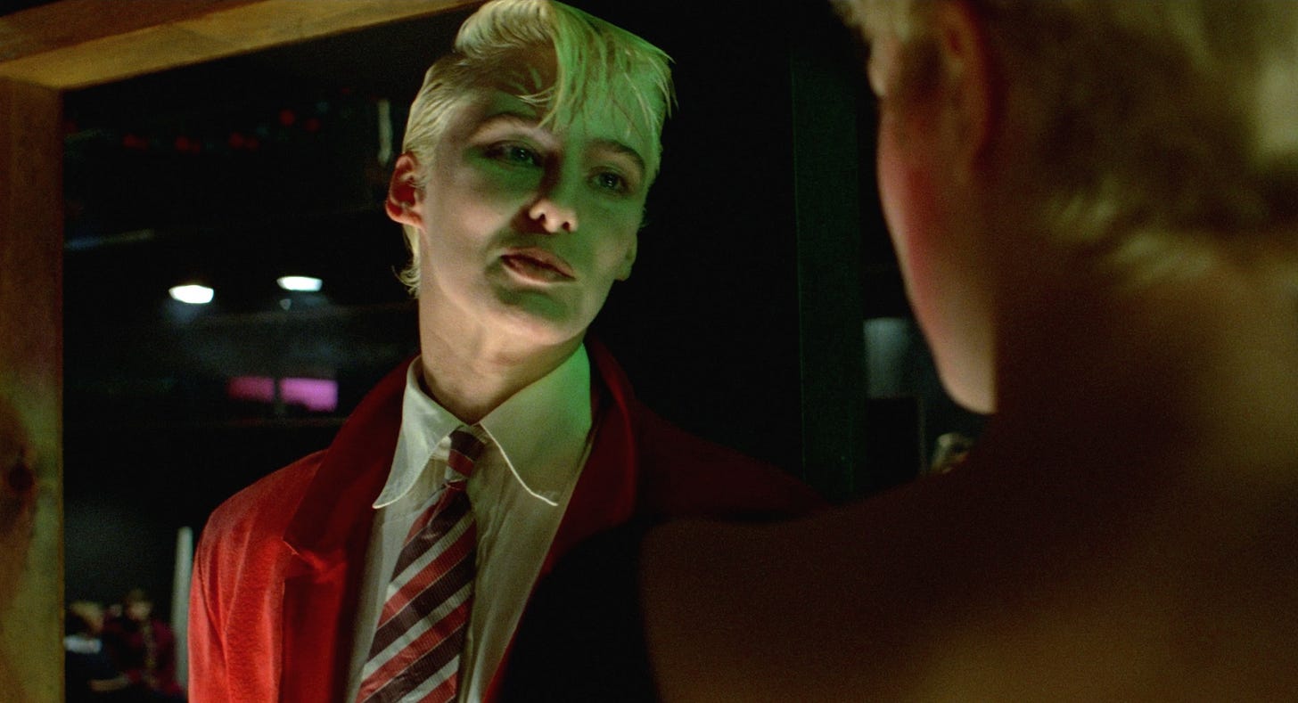 The queer gender and sexuality of the movie is another parallel with Burroughs, but also where it makes a departure from the author. The cut up vignettes that make up parts of Naked Lunch and other books like The Soft Machine (1961) and The Ticket That Exploded (1962) cover all manner of sexual pairings, but perhaps because of the author’s own preferences, masculine gay sex is most prevalent. It would be a step too far to call it hypermasculine, simply because that kind of identity is always foiled by heroin or junk sickness. Although he was married to a woman for a time, Burroughs’ close friends and interior world were mostly homosocial. He famously murdered his wife Joan Vollmer while attempting to shoot a glass off the top of her head at a party, which has since become a living--or dead--metaphor for his relationship to femininity. He is far more associated with the titular Wild Boys of his 1971 novel.