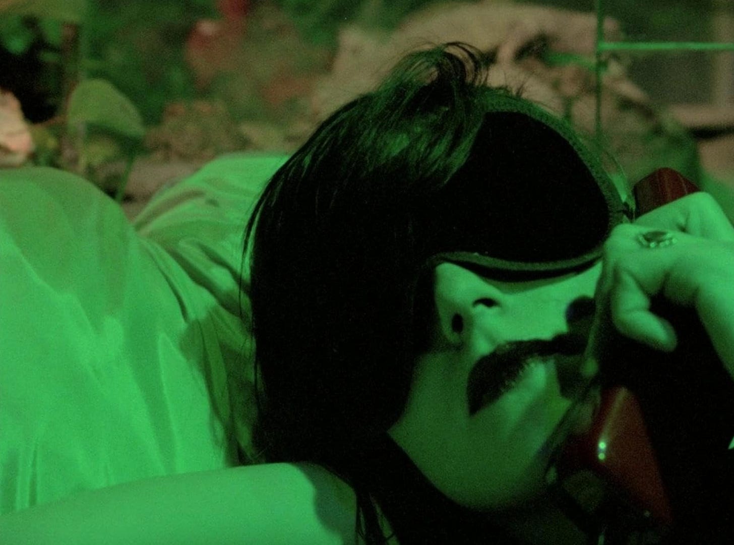 Perhaps what relates Decoder specifically to Liquid Sky is the doubling of the lead female characters. This technique is most apparent in Liquid Sky, where Anne Carlisle plays both Margaret and Jimmy. It lends an androgynous queerness to the film in a way that is clever and compelling. This doubling implicitly ends up being about sexuality when Margaret and Jimmy are encouraged to have sex in front of a crew of onlookers. The doubling that occurs in Decoder has to do with Christiana’s persona as a sex worker. While working as a peep show dancer at the delightfully titled Sexy Eye Land, she becomes a completely different person. After she removes the wig and gets dressed again, Jäger, her stalker, is unable to recognize her. This also has referential significance outside of the movie, in that Christiane F, the person playing the role, was famous in Germany at the time for a book she wrote about her childhood as a prostitute and drug addict. Danielle Burgos writes, “At a juncture in her life where she was trying to escape the shadow of past notoriety while leveraging it into something useful, her character’s double identity as peep-show vamp and insular misanthrope came from the red-light district itself. Ogled without being known, Christiana prefers the company of frogs. The peep-show box she revolves around in resembles Burroughs’s recommended orgone accumulators, units designed by researcher Wilhelm Reich to collect universal sexual life force from the ether and bestow it on the person within.” Aren’t the aliens in Liquid Sky also collecting universal sexual life force as their main purpose in being on Earth? Christiane F’s drug-addled past also brings the comparison of the two movies full circle, with Liquid Sky’s constant preoccupation with heroin.