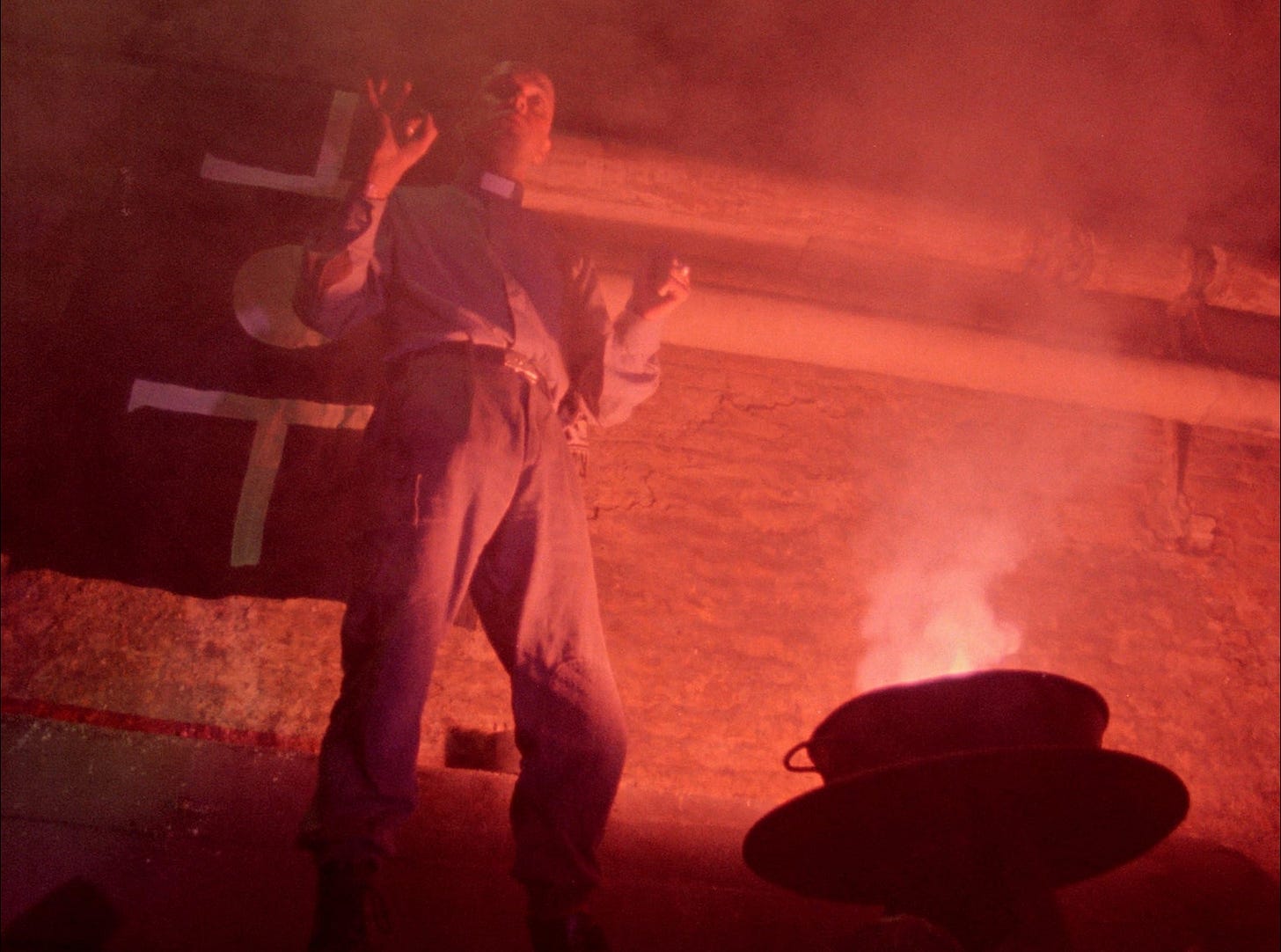 In addition to a dream sequence in which FM goes to an electronic repair shop and gets advice from Burroughs, we get a gritty scene of audio cultists communing with their High Priest, played by Throbbing Gristle/Psychic TV band member Genesis P-Orrige. Through a series of connections, P-Orrige was the caretaker of a large amount of celluloid movie footage that Burroughs and company shot in the 1960s and 70s. It is therefore appropriate for him to appear as this cult-like figure in Decoder, who makes the memorable speech: “Information is like a bank, some of us are rich, some of us are poor for the information. All of us can be rich. Our job, your job is to rob the bank, to kill the guards. To go out there and destroy everybody who keeps and hides the whole information.” This notion goes back to Burroughs’ writings, in which he understood that those who control the flow of information are the ones with the most power. In the movie, this cult is presented in an unexpectedly similar way to “The New World”, the nihilist/fascist cult seen in George P Cosmatos’ action movie Cobra (1986) released a couple of years later. Although the group in Decoder doesn’t have dual axes that they smash together symbolically, they do have fire pits inside of a cavernous, dystopian industrial building. P-Orrige, as their leader, looks like a mixture of Aleister Crowley and a Nazi SS officer. As FM moves to a room further in the back, he discovers a hypnotic dream machine, the device created by Burroughs associate Brion Gysin that induces hallucinogenic states of higher consciousness.